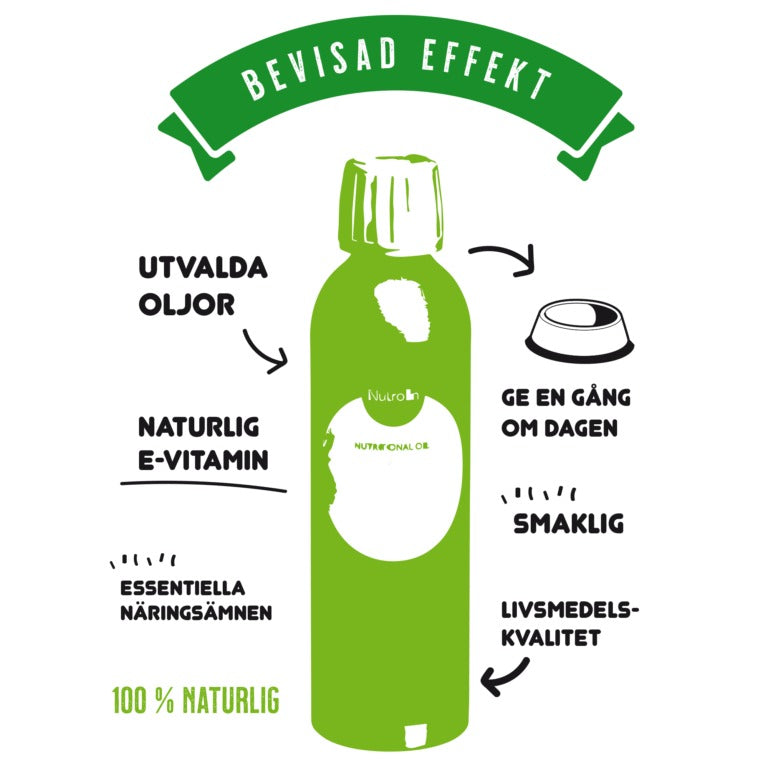 Hunden som får av Nutrolin® SKIN & COAT-oljan får en rasenlig päls. Näringsoljan gör inte den strävhåriga hundens päls mjuk. Därför är hundtrimmarna och utställningsfolket speciellt förtjusta i SKIN & COAT. Näringsoljan minskar även pälsfällning och mjällning. Sköra klor blir starka och sträva trampdynor mjuka. Bakom dessa positiva effekter står kunskap baserad på forskning om att störningar i huden ofta orsakas av alltför torr hud. Linolsyra som fås ur kosten skyddar huden mot att att bli alltför torr. Samtidigt stödjer den hudens, pälsens, klornas och trampdynornas hälsa. SKIN & COAT innehåller rikligt med linolsyra och vid regelbunden användning förstärker näringsoljan hudens naturliga skydd.