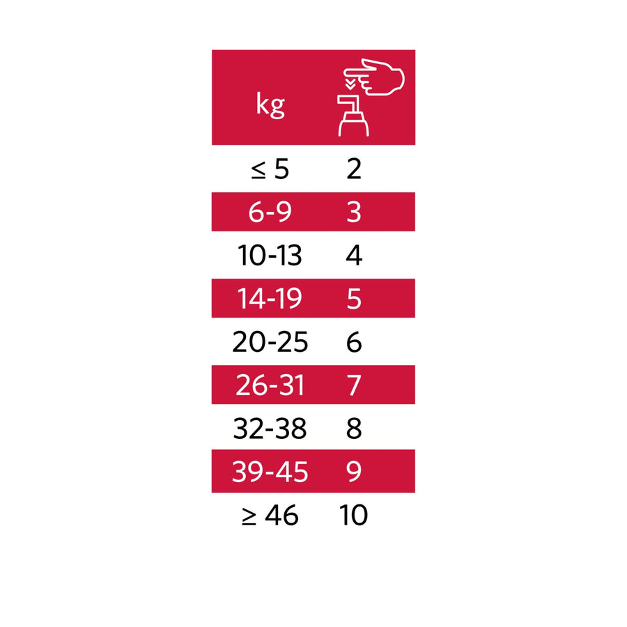 Daglig dosering tillsammans med hundens foder eller separat. Ett tryck på pumpen ger 2 ml.