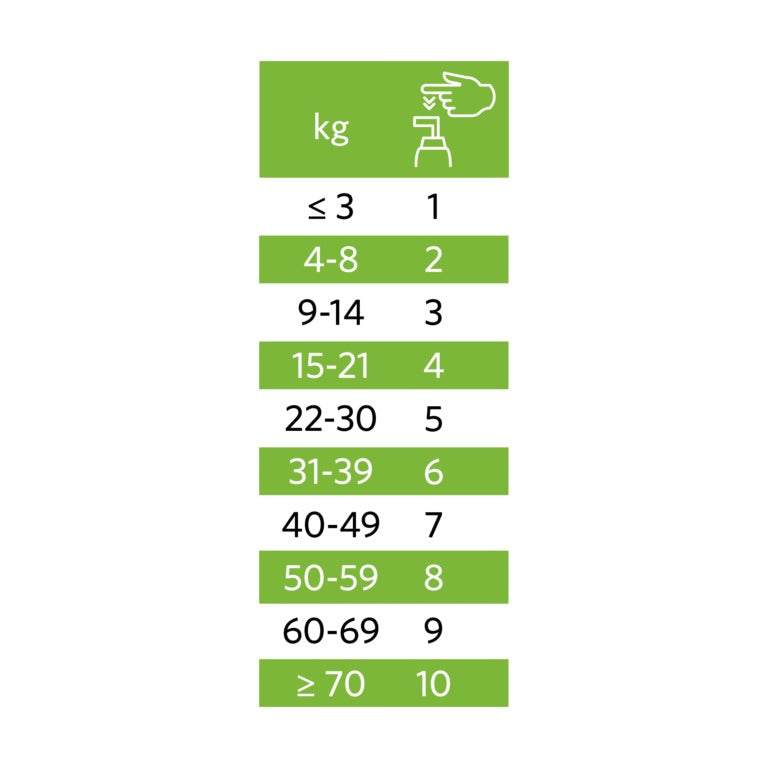 Daglig dosering tillsammans med hundens foder eller separat. Ett tryck på pumpen ger 2 ml.