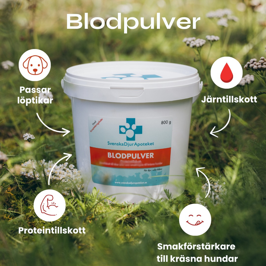 Svenska DjurApotekets Blodpulverär ett proteintillskott rikt på järn, passar tikar under löp fram till ev skendräktighet eller under dräktighet och digivning.