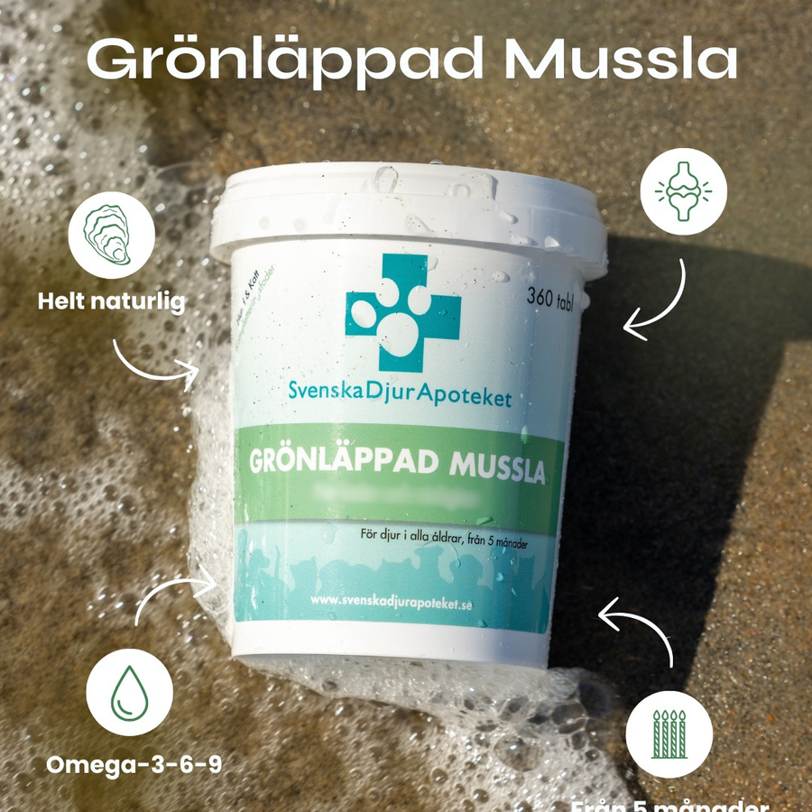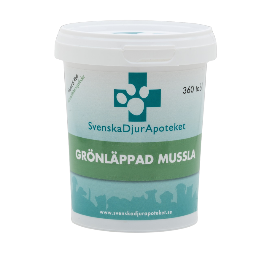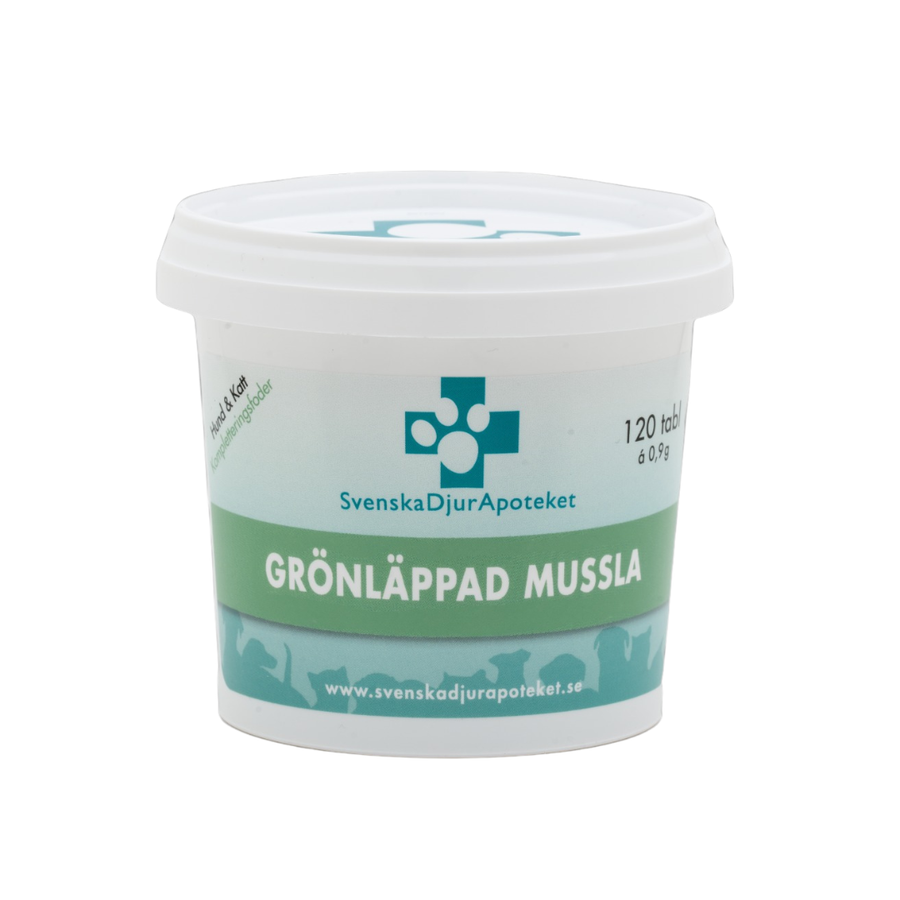 Svenska DjurApotekets Grönläppad Mussla är en naturlig produkt från Nya Zeeland. Grönläppad Mussla innehåller många nyttiga näringsämnen som glukosaminoglukaner, kondroitin, omättade fettsyror, omega-3,-6, -9 och mineraler.